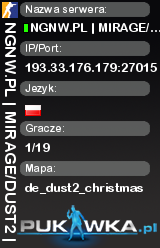 NGNW.PL | MIRAGE/DUST2 | WINTER EDITION | NOZE | SKINY | REKAWI | de_dust2_christmas | 193.33.176.179:27015 | 1/19 | Standard | ![]() |
