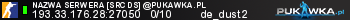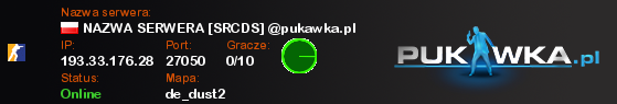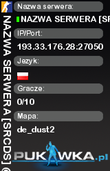 NAZWA SERWERA [SRCDS] @pukawka.pl | de_dust2 | 193.33.176.28:27050 | 0/10 | Standard | ![]() |