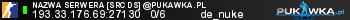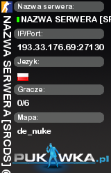 NAZWA SERWERA [SRCDS] @pukawka.pl | de_nuke | 193.33.176.69:27130 | 0/6 | Standard | ![]() |