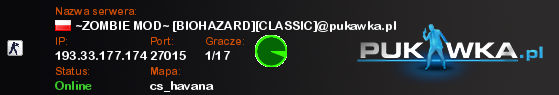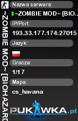 ZOMBIE MOD [BIOHAZARD][CLASSIC]@pukawka.pl | cs_militia | 193.33.177.174:27015 | 1/17 | Premium | ![]() |