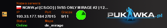 NGNW.pl [CS:GO] | 5VS5 ONLY MIRAGE #2 | 128 TR | !ws | !knife | !wanted | !gloves | !shop | NOCNY VIP | de_mirage | 193.33.177.184:27015 | 4/11 | Standard | ![]() |