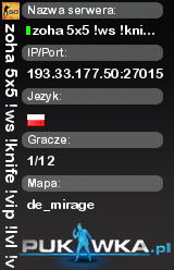 zoha 5x5 !ws !knife !vip !lvl !viptest | de_mirage | 193.33.177.50:27015 | 1/12 | Premium | ![]() |