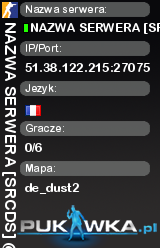 NAZWA SERWERA [SRCDS] @pukawka.pl | de_dust2 | 51.38.122.215:27075 | 0/6 | Standard EU | ![]() |