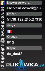 serverdlacweli@pukawka.pl | de_dust2 | 51.38.122.215:27330 | 0/12 | Standard EU | ![]() |